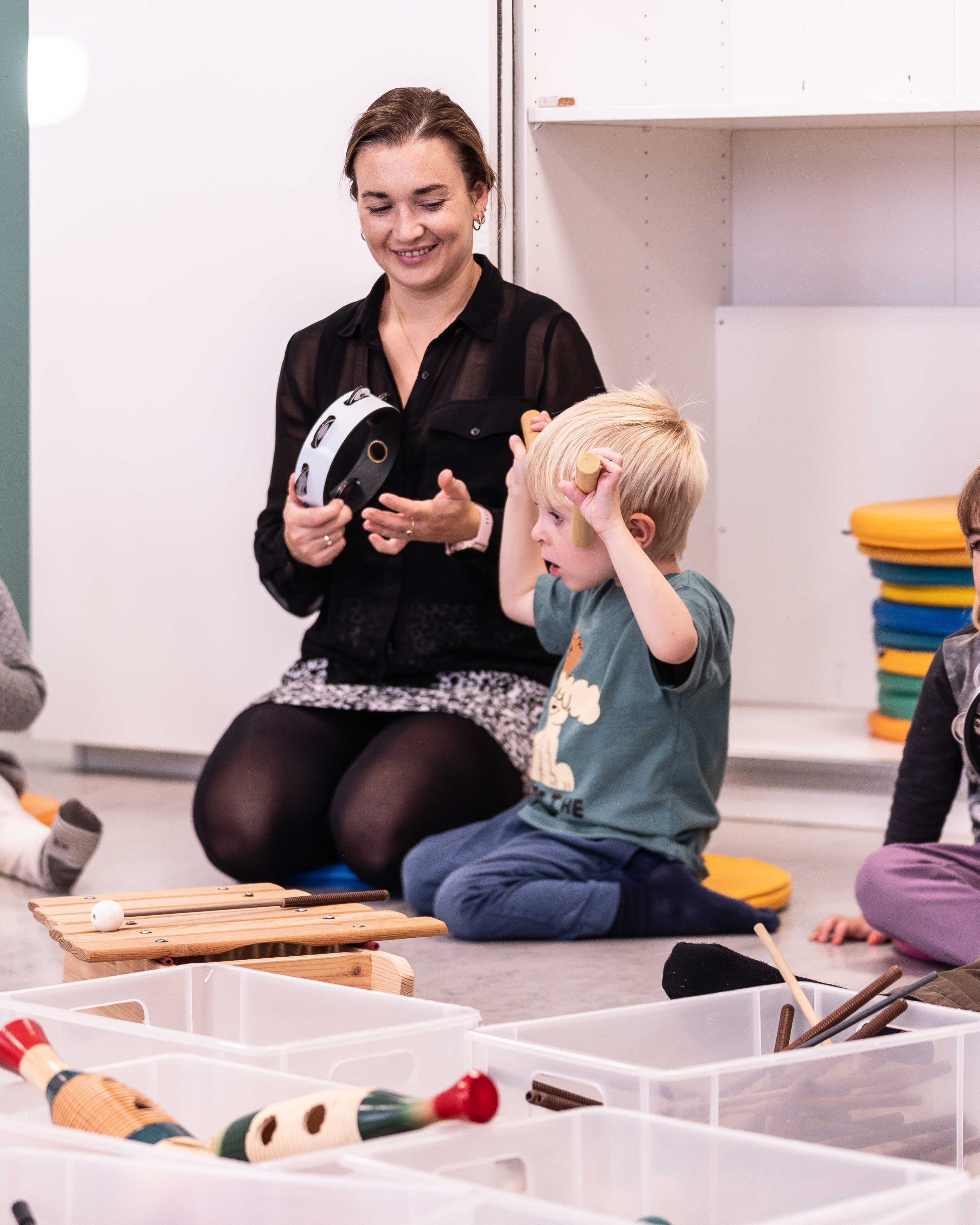 Svendborg Musikskole har en lang tradition for at undervise de mindste børn i musik. Derfor er skabene fulde af farverige instrumenter, bolde, tørklæder, trylleæsker, krammedyr og meget mere.